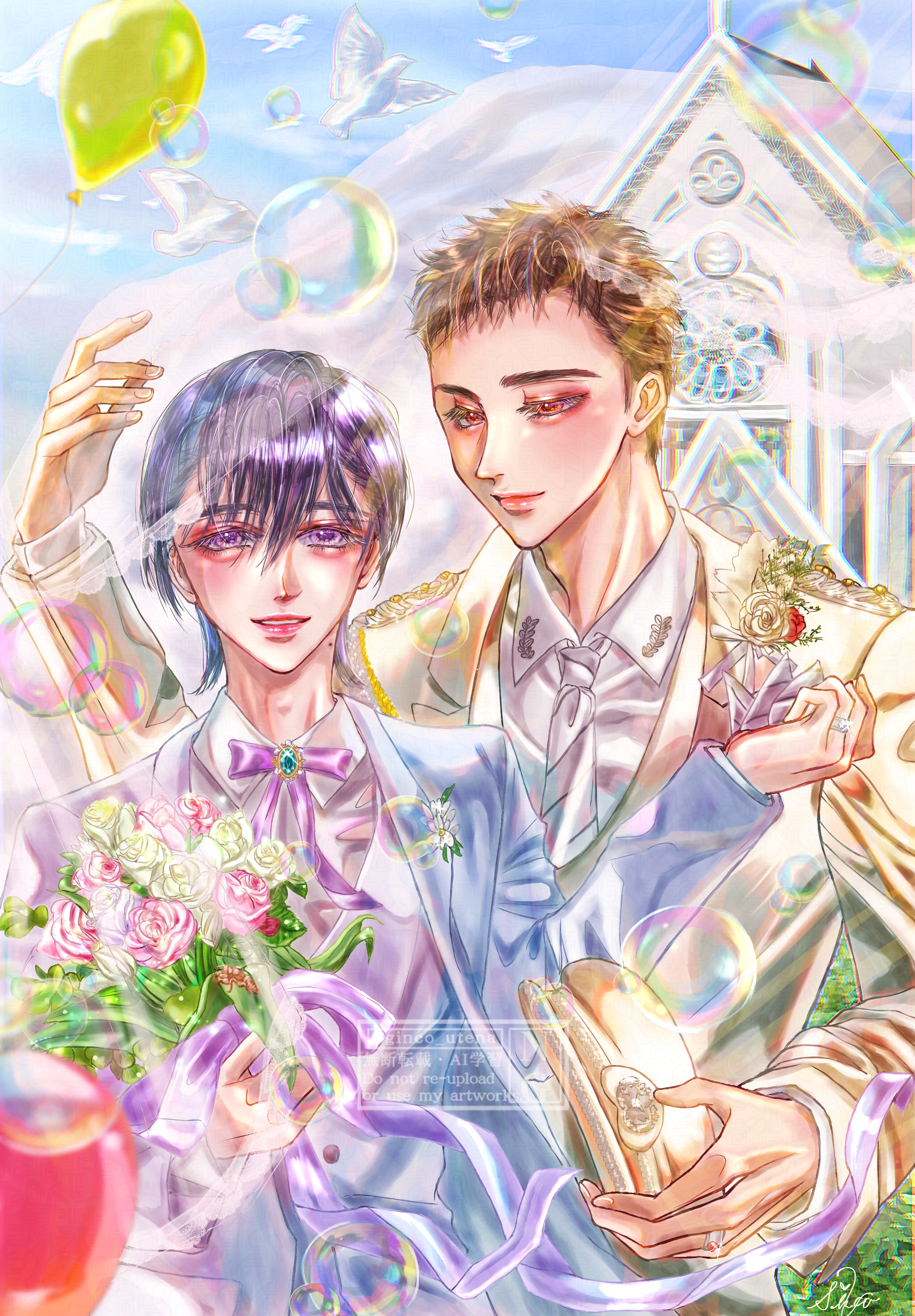 拙作『塀のうち〜』の全力ウェディング絵💒 ふたりが歌を詠みあったり仲良くなりだしたのが夏なので、 エピソードも入れた蝉の抜け殻をブーケに。
