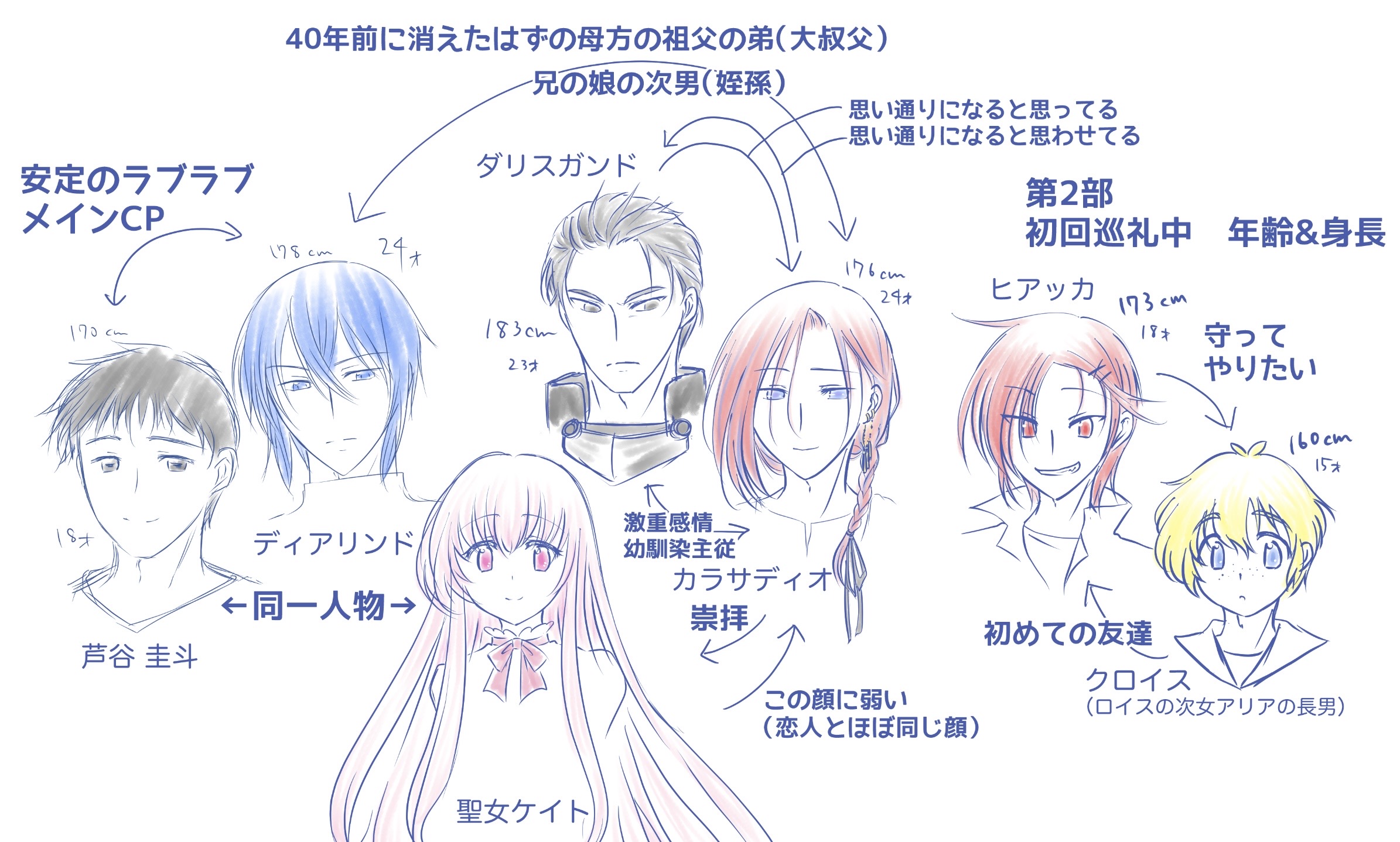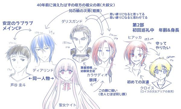 7巻以降の新キャラ達の身長差と相関図です。 聖女のケイト様の髪は腰のあたりはゆるウエーブがかかっていて、ふわんふわんなんですが……。←画面に入り切れてない。 脳内補完でお願いします💦
