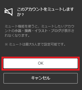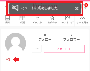 ⑤ページ上部へ「ミュートに成功しました」と表示され、アイコン画像下に下記のようなマークが表示されたらミュート設定完了です。