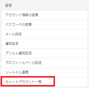 メニュー内「設定」より「ミュートアカウント一覧」を選択すると一覧が表示されます。