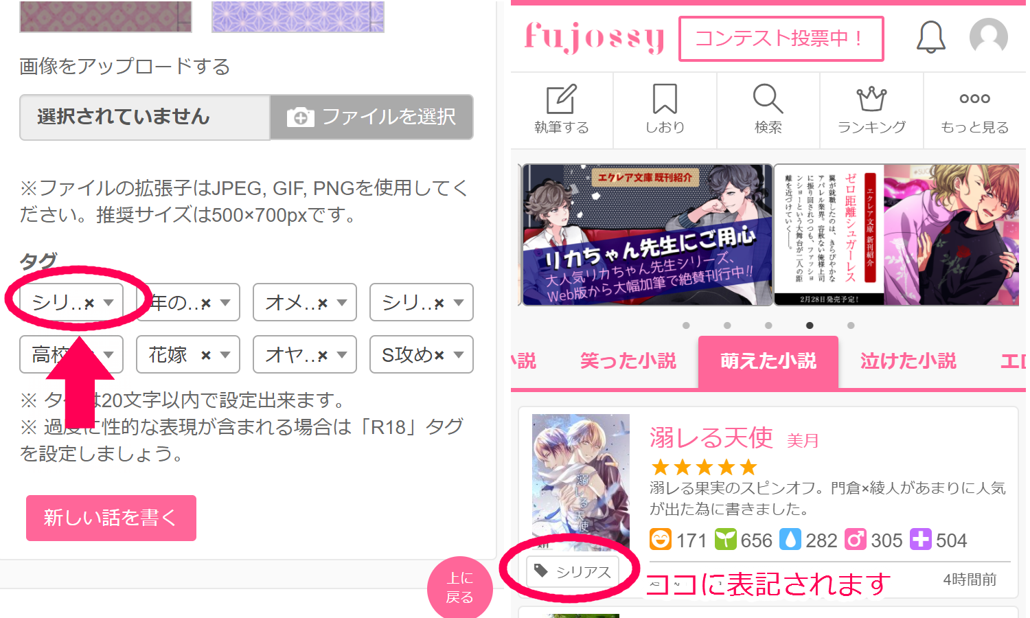 作品のジャンルや属性などに合わせたタグを選んで12個まで作品につけることができます。