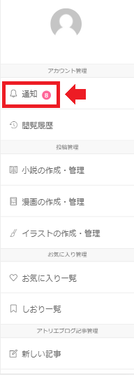 新着通知がある場合、サイト右上アイコン内の「通知」横に表示されます。