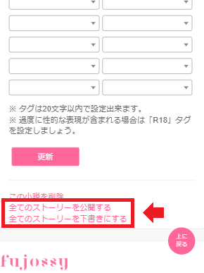 なお、下書きに戻した作品は、「小説の作成・管理」→該当作品の「基本情報」最下部にある「全てのストーリーを公開する」で一括に公開したり、「全てのストーリーを下書きにする」で一括に下書きに戻したりすることができます。