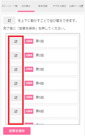 書いた作品の順序を並び替えたい場合、 「小説の一覧・管理」内の「ストーリー一覧」より「ストーリーの並び替えはこちらから」を選択し、 ストーリー行にある矢印をドラッグ&ドロップすることで並び替えが可能です。