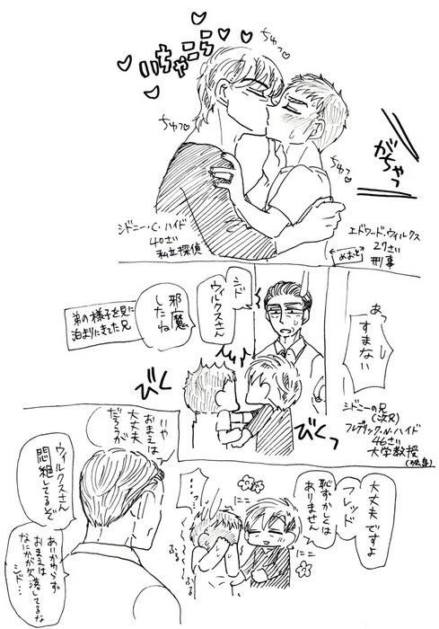いちゃつく探偵と刑事と、探偵のお兄さん(次兄のフレデリック)。