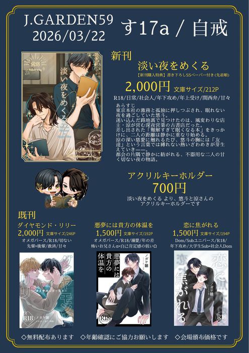 今回は新刊1作品、既刊3作品、そして初めてのグッズとなるアクキーをご用意してお待ちしております☺️
